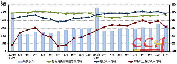 國家統(tǒng)計局日前發(fā)布消費市場最新數(shù)據(jù),11月份,全國餐飲收入3034億元,同比增長11.5%,高于上年同期1.7個百分點;限額以上單位餐飲收入804億元,同比增長6.5%,比上年同期上漲4.1個百分點。單月來看,11月餐飲市場發(fā)展增速大幅回落,餐飲收入增速環(huán)比下跌0.9個百分點,限上餐飲收入更是環(huán)比下跌達(dá)2.3個百分點,全國餐飲市場與社會消費品零售總額增幅(11.2%)的差距也縮至0.3個百分點,優(yōu)勢不再明顯。