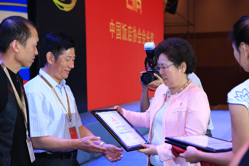 中國飯店協(xié)會會長韓明女士給獲獎嘉賓頒獎