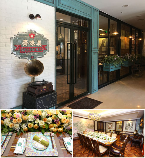 最后,對品牌進(jìn)行提升。以美味齋為例,在確定美味齋主打大上海,小資味,突出時(shí)尚情調(diào)后,我們選取了Tiffany藍(lán)作為餐具主色調(diào),將公共區(qū)域、散臺(tái)、包廂等打造成大上海、小資味風(fēng)格,以適應(yīng)閨蜜“拍照”黨。在餐位上,選取適合兩人用餐或快速拼桌的魔方桌,自由組合餐臺(tái),提高翻臺(tái)率。